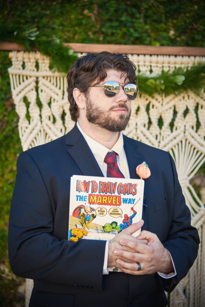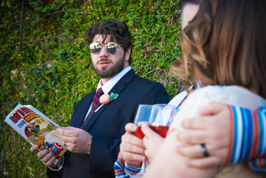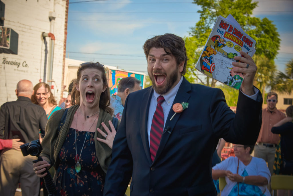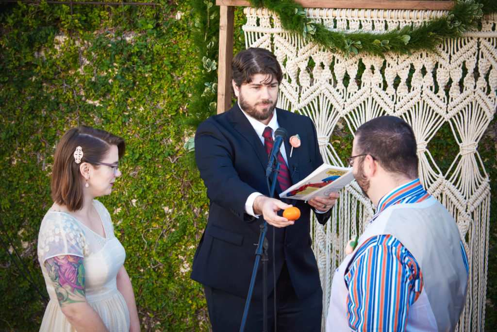 The officiant, Jim Reiman, performed the ceremony out of a Spider-Man comic. He also pulled an orange out of his suit and began preaching on “The Secrets of a Successful Wedding” from the immortal words of Homer Simpson. I know what you are wondering, “Who would do such a thing?” Well Jim and Adam are best friends and was also a student at USF at the time Adam and Sara met. If anyone would know the personalities of Sara and Adam, it would be Jim.